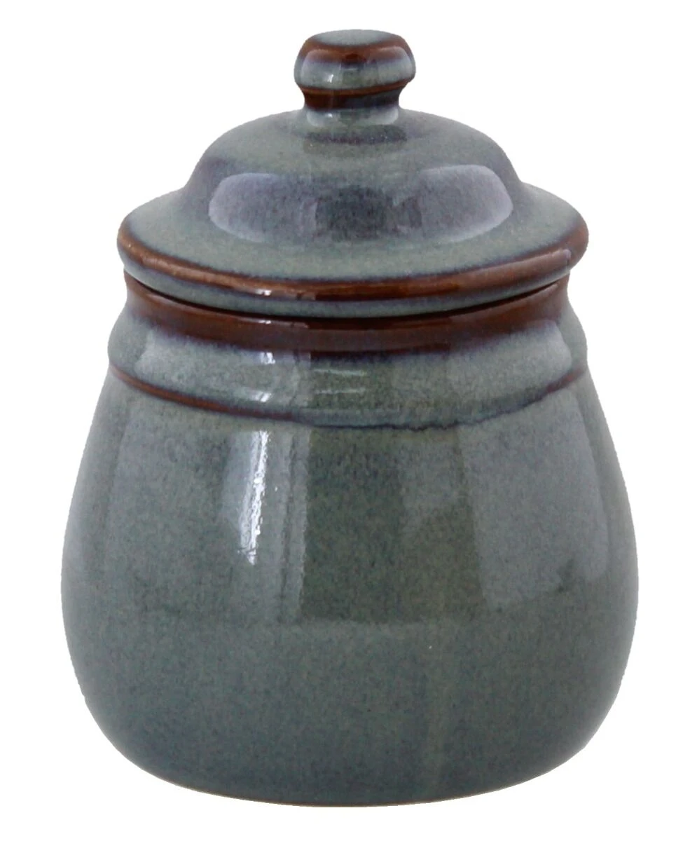 Het ronde suikerpotje van Oldenhof 1821 is gemaakt van olijfgrijs, geglazuurd aardewerk. Gebruik het suikerpotje om suiker in te doen voor op tafel bij de koffie of thee.