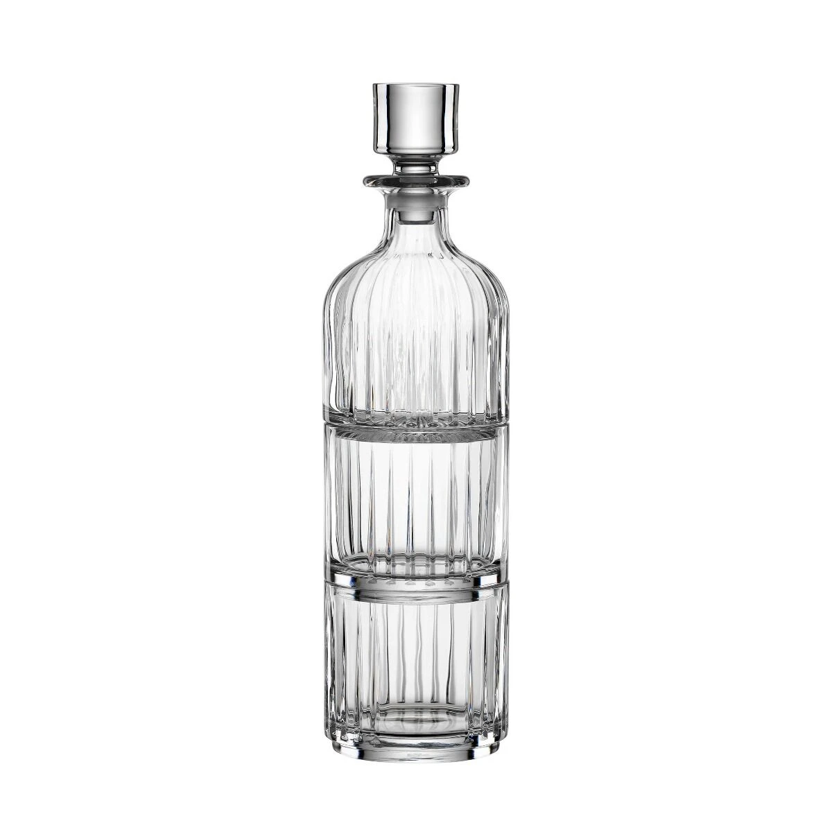 De Oldenhof Bar Selection deluxe whiskyset bestaat uit een kleine karaf en twee glazen. De set is vervaardigd van kristalglas en is volledig stapelbaar. Helemaal gestapeld is de set 32 cm hoog en de diameter van alle delen is 9,5 cm. De karaf heeft een totale inhoud van 340 ml, en de glazen hebben beiden een totale inhoud van 320 ml. Het glas van alle delen heeft een decoratief patroon aan de buitenzijde.