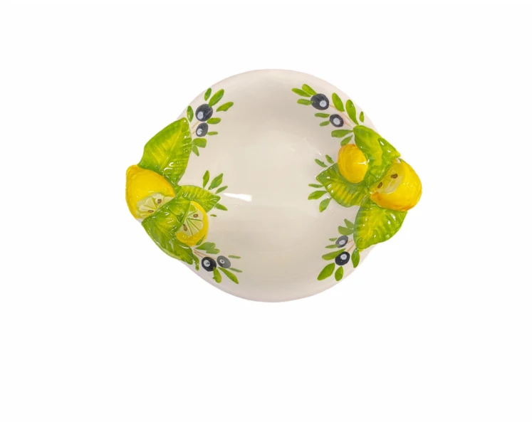 De Oldenhof diepe schaal is gemaakt van wit aardewerk en is gedecoreerd met citroenen en groene bladeren. De schaal heeft een doorsnede van 13 cm. Gebruik de schaal om gerechten in stijl te serveren en presenteren.