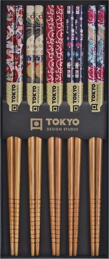De Oldenhof eetstokjes zijn gemaakt van lichtbruin hout met een kleurrijk motief en hebben een lengte van 22,5 cm. De stokjes komen in een verpakking met 5 sets van 2 eetstokjes. Gebruik de eetstokjes voor het eten van Aziatische gerechten als sushi of noedels.