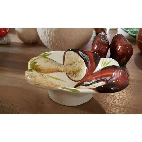 De ronde Oldenhof schaal is gemaakt van wit aardewerk en is gedecoreerd met paddenstoelen. De diameter van de schaal is 15 cm. Gebruik de persenteerschaal voor de presentatie van herfstige gerechten.
