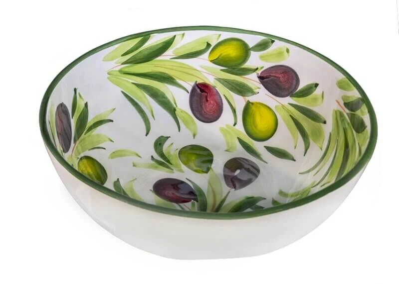 De Oldenhof-schaal heeft een olijfmotief en een diameter van 21 cm. De schaal is gemaakt van keramiek en te gebruiken voor het presenteren van fruit, (stok)brood of pasta.