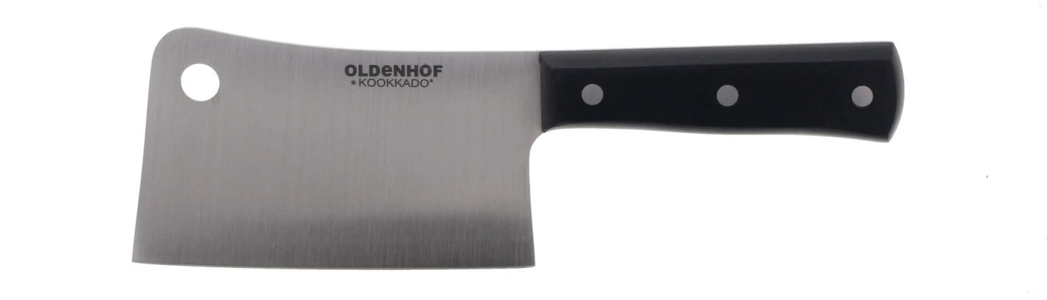 De Oldenhof hakbijl is vervaardigd van gesmeed messenstaal en heeft een lemmet van 14 cm. Het mes is voorzien van een zwart kunststof heft met 3 klinknagels. Gebruik de hakbijl om grote stukken vlees en botten te doorklieven.